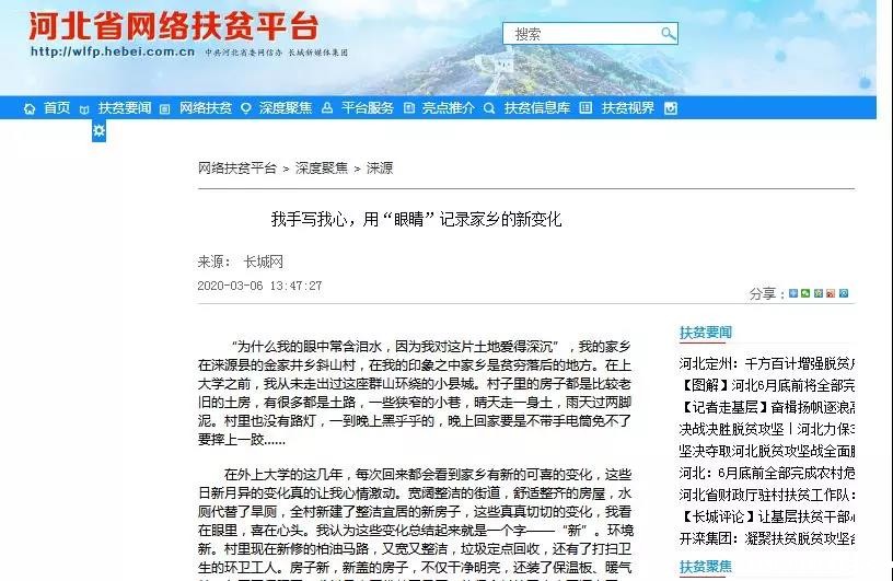 张震同学的文章《我手写我心,用“眼睛”记录家乡的新变化》被河北省网络扶贫平台转载。