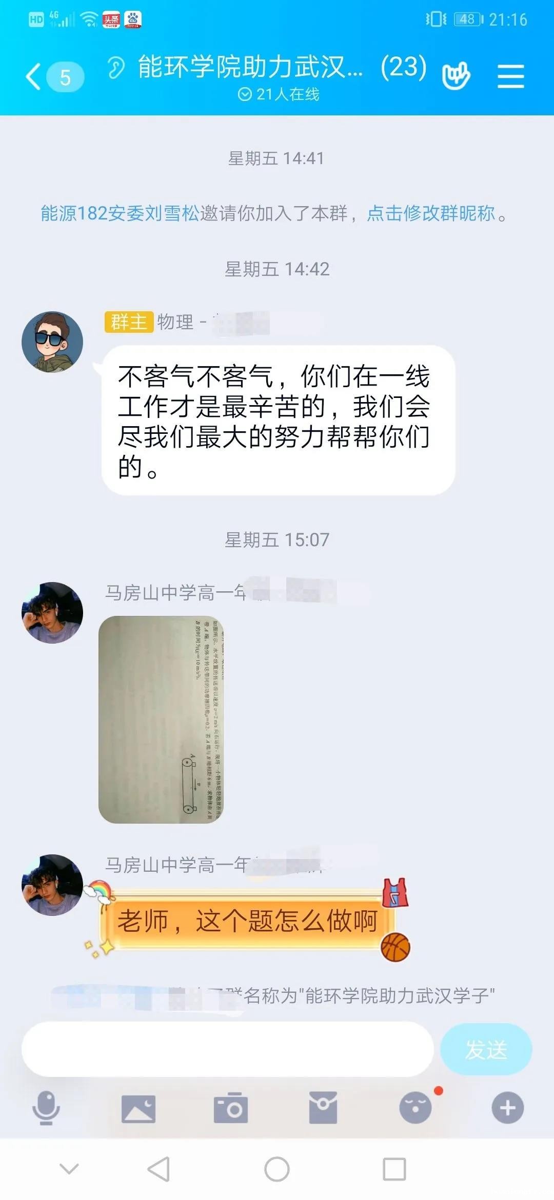 能环志愿者和学生们也通过QQ、微信等通讯工具交流学习问题,同时也建立起了友谊。尽职尽责的能环志愿者们不仅认真照看学生的学习情况,也细心呵护他们的坚强的小心灵,为奋战在武汉一线的医护家长减轻了负担,给了他们更多的力量。